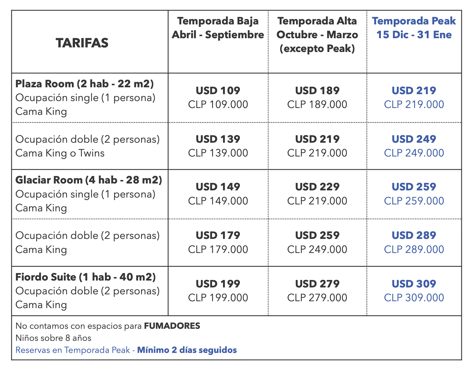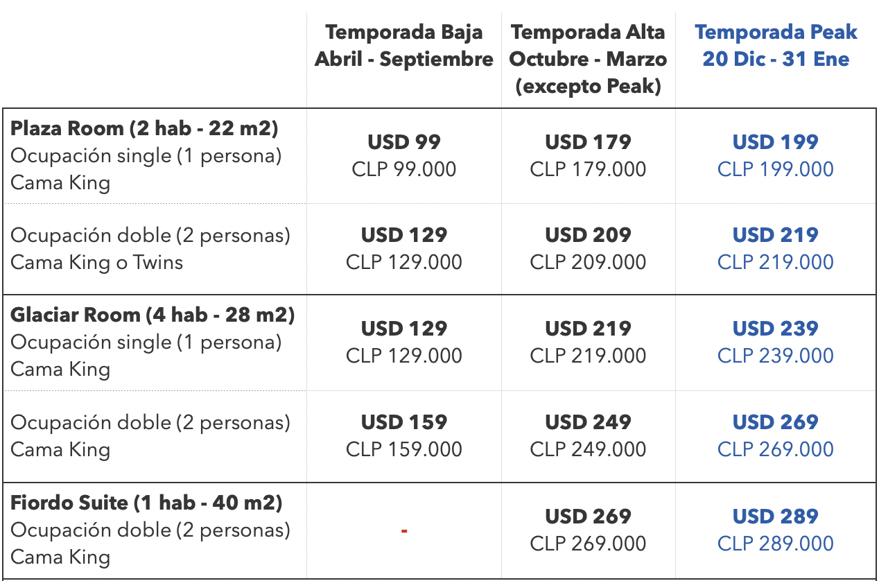 Todas las tarifas están publicadas en USD (dólares americanos) y exentas de Iva. Para pasajeros extranjeros no residentes en Chile, se aplicará la franquicia tributaria presentando su pasaporte vigente y tarjeta de ingreso al país.